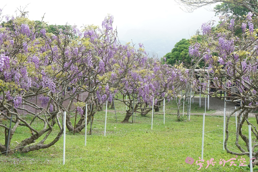 發現這裡的紫藤花有用心的照顧,一簇簇的花串,沒有多餘的枝葉,整片花園都是夢幻的紫色,不得不佩服園區的用心照料。