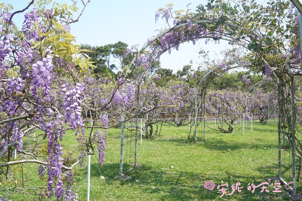 這裡的拱門紫藤隧道好夢幻啊!一簇簇紫藤蔓開在拱門的花架上,連綿不絕的紫藤花之隧道,像走進童話繪本裡的感覺呢。
